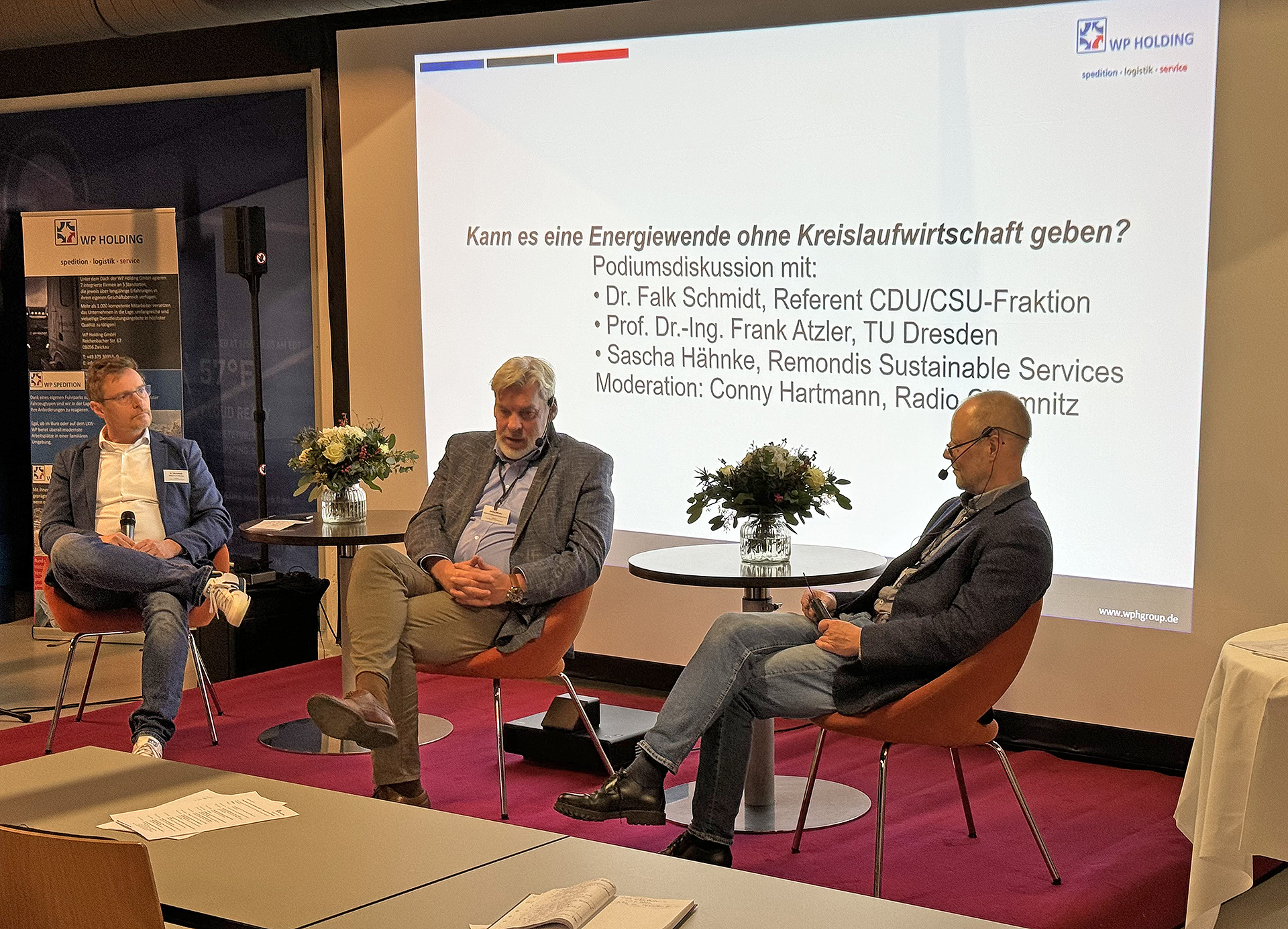 In einer abschließenden Podiumsdiskussion resümierten Dr. Falk Schmidt, Sascha Hähnke und Prof. Dr.-Ing. Frank Atzler über die Faktoren einer gelingenden Energiewende und den Beitrag, den eine ökologisch und ökonomisch erfolgreiche Kreislaufwirtschaft dabei leisten kann.