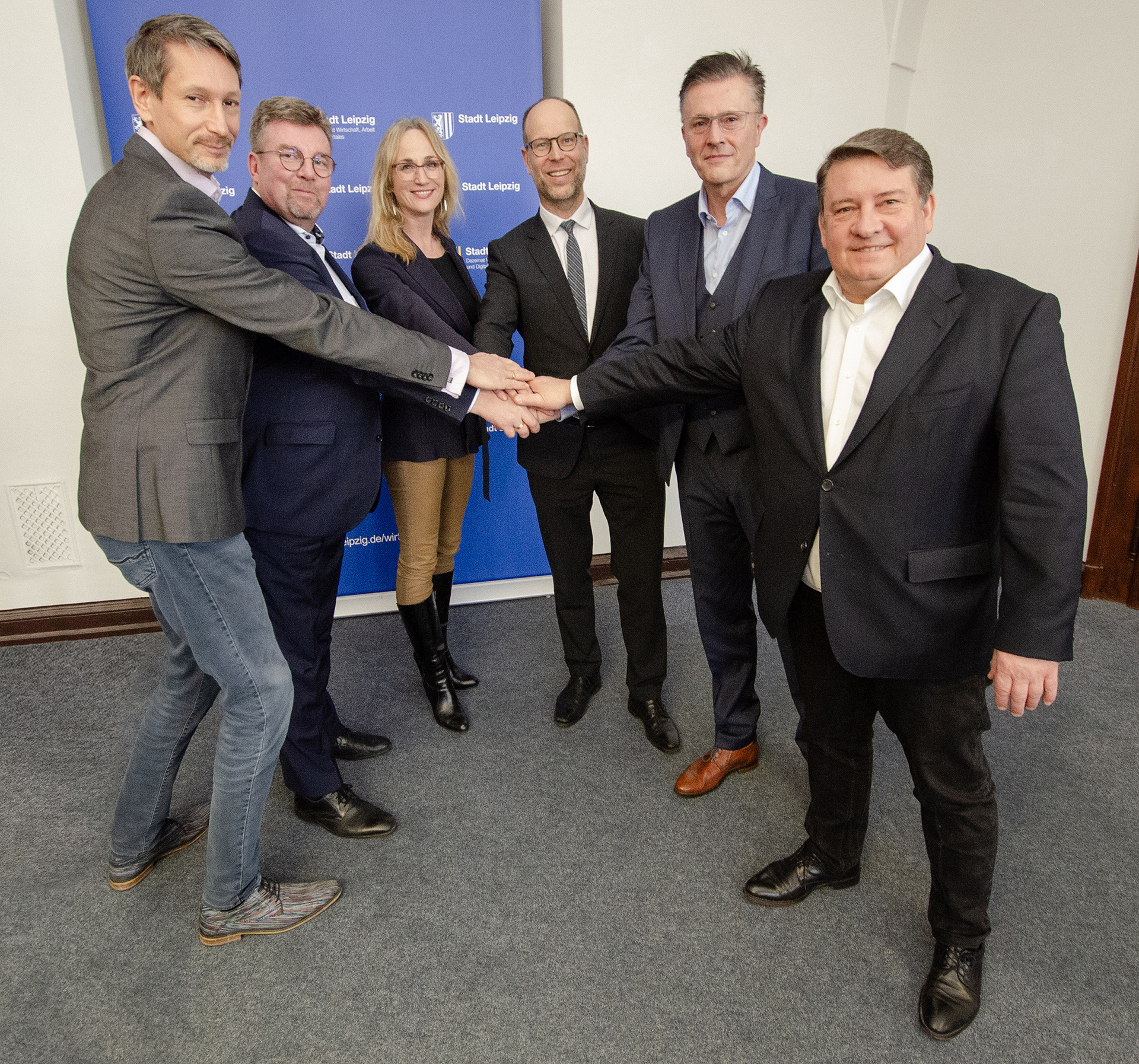 (v.l.n.r.) Kai-Uwe Blechschmidt, Vorstandsvorsitzender des Netzwerk Energie & Umwelt (NEU) e. V., Daniel Landgraf und Angelika Bordt, Vorstände im NEU e. V., Clemens Schülke, Bürgermeister und Beigeordneter für Wirtschaft, Arbeit und Digitales der Stadt Leipzig, Dierk Näther, stellvertretender Vorstandsvorsitzender sowie Toralf Weiße, Vorstandsvorsitzender des Netzwerk Logistik Mitteldeutschland e. V.