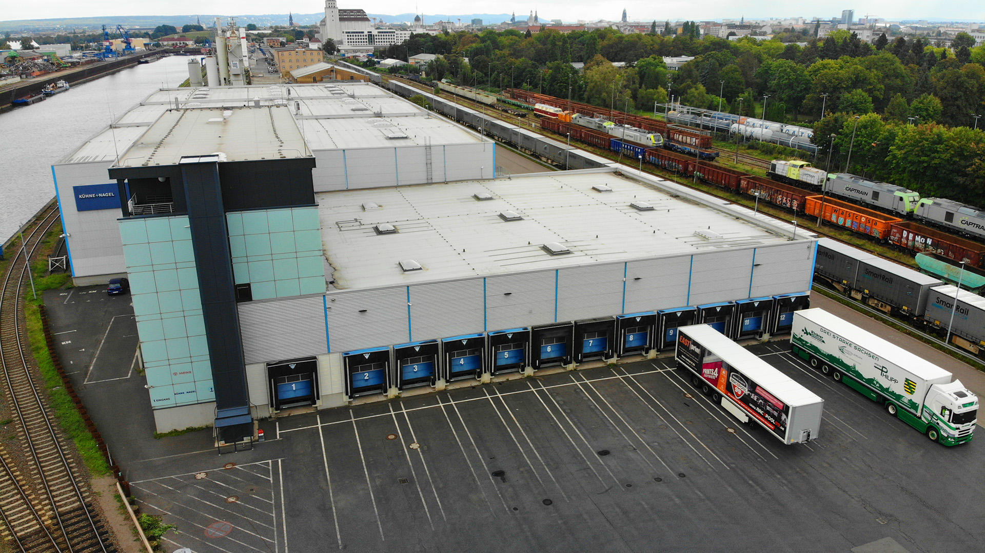 Ein weiterer Standortvorteil: Der Alberthafen ist trimodal angebunden – per Schiff, Bahn und Straße. Ein eigener Gleisanschluss mit überdachter Rampe (ca. 550 m²) sowie insgesamt 30 Verladetore garantieren schnelle und effiziente Umschlagprozesse. Mitten im Zentrum Dresdens gelegen, bietet der Standort Unternehmen in der Region optimale Anbindungen und kurze Wege.
